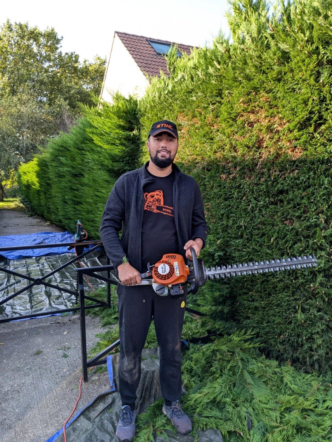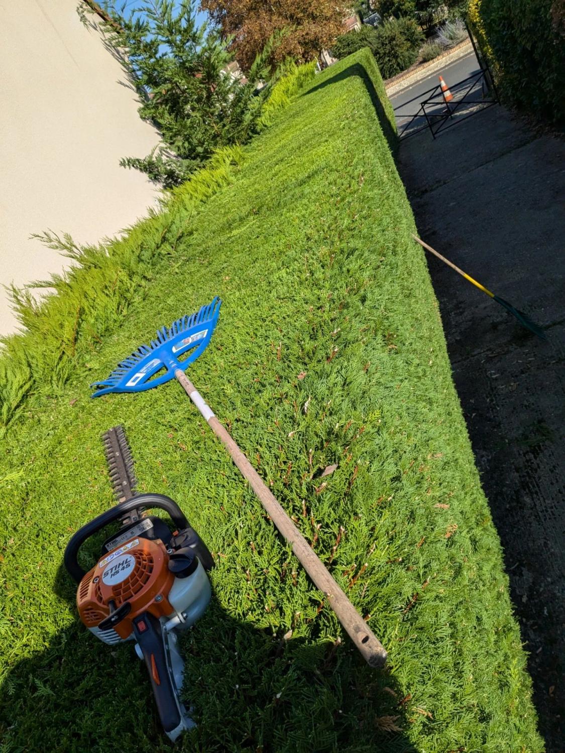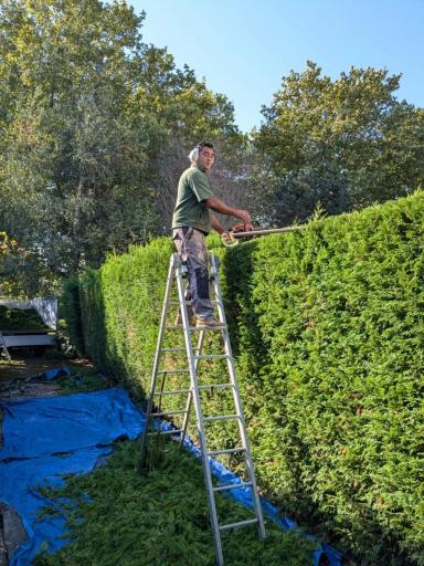 Taille d'une haie de cyprès des Landes taille de la hauteur de l'ail avec un taille-haie à lésigny